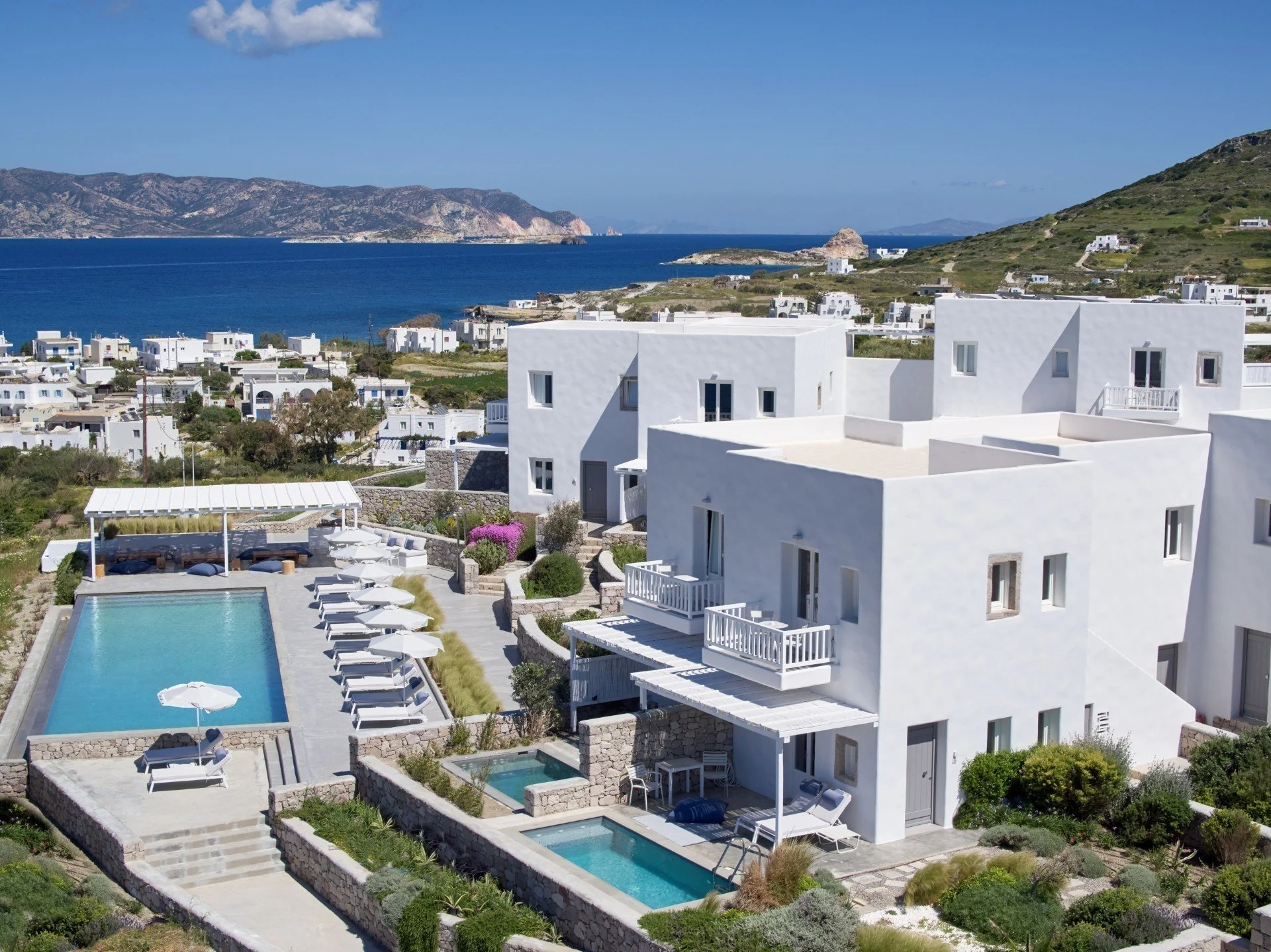 We kick off our Greek adventure at the Milos Breeze Boutique Hotel. This gorgeous property is a stylish clifftop retreat overlooking the Aegean Sea, just a stone’s throw from the charming village of Pollonia, Milos. This hotel combines elegant Cycladic design with modern comfort. It offers breathtaking sunset views, a serene infinity pool, and a truly relaxed island atmosphere.